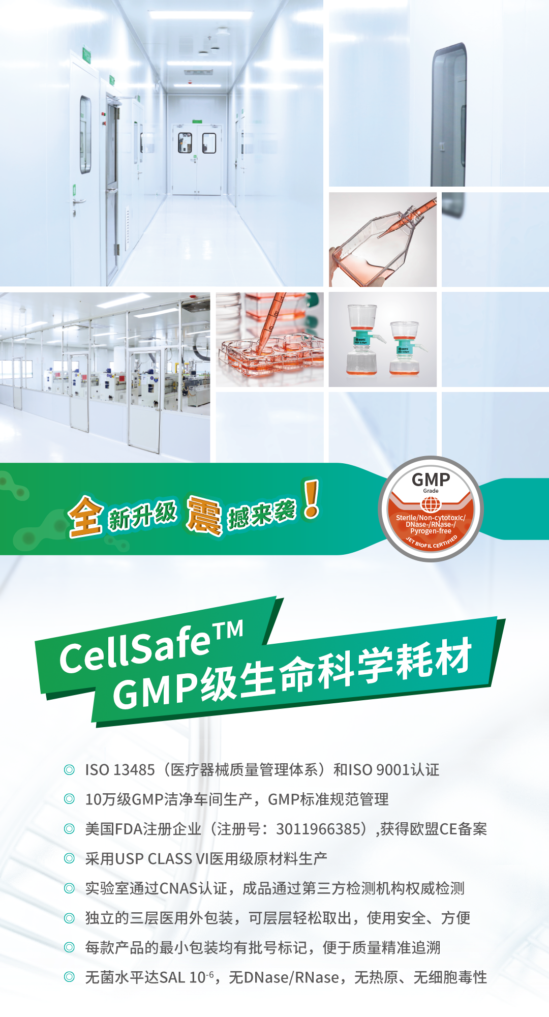 潔特生物GMP級(jí)生命科學(xué)耗材——CellSafe™系列產(chǎn)品全新升級(jí)、重磅來(lái)襲,該系列產(chǎn)品按照GMP質(zhì)量標(biāo)準(zhǔn)要求生產(chǎn),高潔凈度、高安全性,可滿足細(xì)胞治療、基因治療、抗體、疫苗等生物制藥企業(yè)及其他潔凈實(shí)驗(yàn)室對(duì)生物實(shí)驗(yàn)耗材有更高潔凈等級(jí)要求的標(biāo)準(zhǔn)化制造與規(guī)?;a(chǎn)。