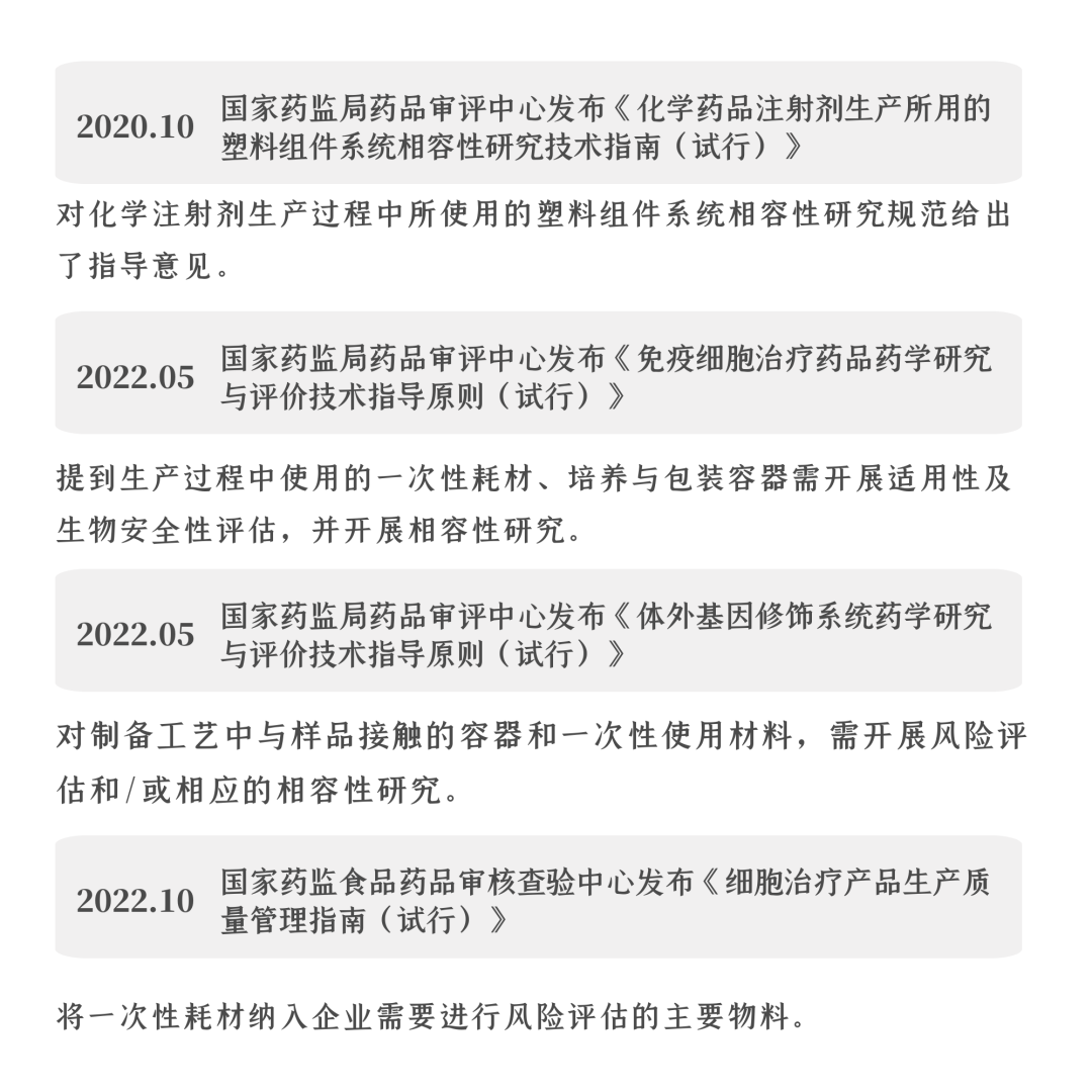 伴隨著生物醫(yī)藥行業(yè)的蓬勃發(fā)展,抗體、疫苗、重組蛋白、細(xì)胞治療、基因治療等生物醫(yī)藥需求增大,對(duì)生物制品相關(guān)的耗材產(chǎn)品也催生出更高要求。國(guó)家多項(xiàng)法規(guī)對(duì)生物實(shí)驗(yàn)室耗材提出了明確的方向性意見(jiàn),包括適用性研究、生物安全性研究、生物相容性研究等。